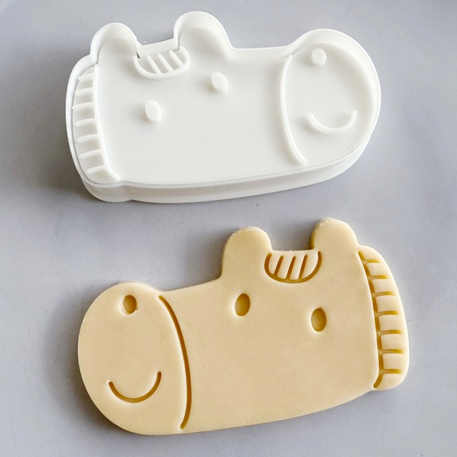 2026年の干支、午のお年賀スタンプクッキー型 1つでインパクトのあるサイズ感です。 ハトサブレのような1枚でインパクトのあるサイズ感にしています。 スタンプ付きなのでそのまま型抜きでも、アイシングしてカラーにしても 可愛くお使いいただけます。 【商品内容】 クッキー型 外枠1個+スタンプ1個 【サイズ】 クッキー型外枠の内寸です 約7.3cm / 7.1cm 【素材】 PLA(植物由来のプラスチック) 【ご使用上のご注意】 プリンタの特性上、ざらつきや小さな隙間があったり、細い糸が残ることがあります。 細い線や細かい部分の破損にお気をつけください。 スタンプ型は細かい作りになっていますので、1度粉をはたいてから抜くと綺麗に抜けやすくなります。 電子レンジ、オーブン、食洗機にはお使いいただけません。 熱に弱いので、火気のそばには置かないでください。 -------------------------------------------------------------------------- ※プリンターの造形時特有のざらつき、小さな隙間、細い糸が残っている事がありますが異常ではありません。 ※造形層など気になる方は購入をおすすめできません。 ※イラストレーターとのコラボ作品の多くはイラストの良さを損なわないように 曲線をそのまま使っています。 正円、直線、左右対称ではないことをあらかじめご理解ください。 ※丁寧にお作りしておりますが、ハンドメイドな為接着剤のはみ出しやズレが微妙にある場合がございます。 (取れにくいように食品衛生法適合の接着剤で多めに使用しております) 取れてしまった場合は、申し訳ございませんがお手持ちの接着剤などでとめてください。 ※小さなパーツを使用している場合もございますので、お子様の誤飲などにも注意してください。 -------------------------------------------------------------------------- NEWYEAR お正月 リース うさぎ 2025年 巳 お年賀 めでたい お祝い 新年